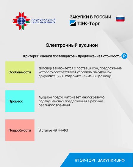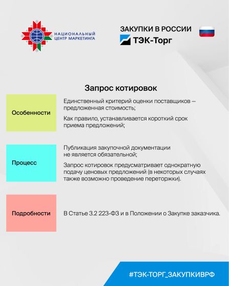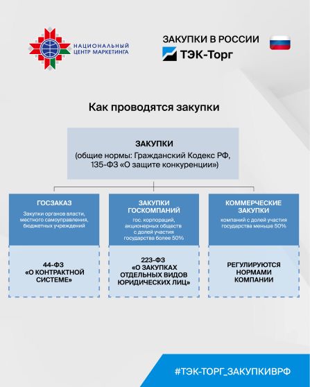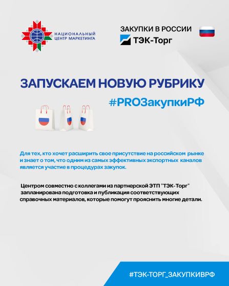 Коллеги, мы запускаем новую рубрику #PROзакупкиРФ для тех, кто хочет расширить свое присутствие на российском рынке и , возможно, уже знает о том, что одним из самых эффективных экспортных каналов является участие в процедурах закупок. Национальный центр маркетинга помог многим белорусским компаниям принять участие в закупках российских организаций, заключить контракт и получить оплату за поставку. У них получилось - почему бы не попробовать и вам?
