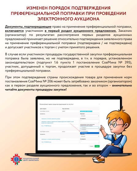 2.Установлен новый порядок подтверждения участником своего соответствия требованиям к участникам процедур госзакупок; применения преференциальной поправки в размере 25%; подтверждения преференциальной поправки при проведении электронного аукциона.