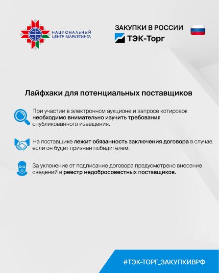 Коллеги, мы запускаем новую рубрику #PROзакупкиРФ для тех, кто хочет расширить свое присутствие на российском рынке и , возможно, уже знает о том, что одним из самых эффективных экспортных каналов является участие в процедурах закупок. Национальный центр маркетинга помог многим белорусским компаниям принять участие в закупках российских организаций, заключить контракт и получить оплату за поставку. У них получилось - почему бы не попробовать и вам?