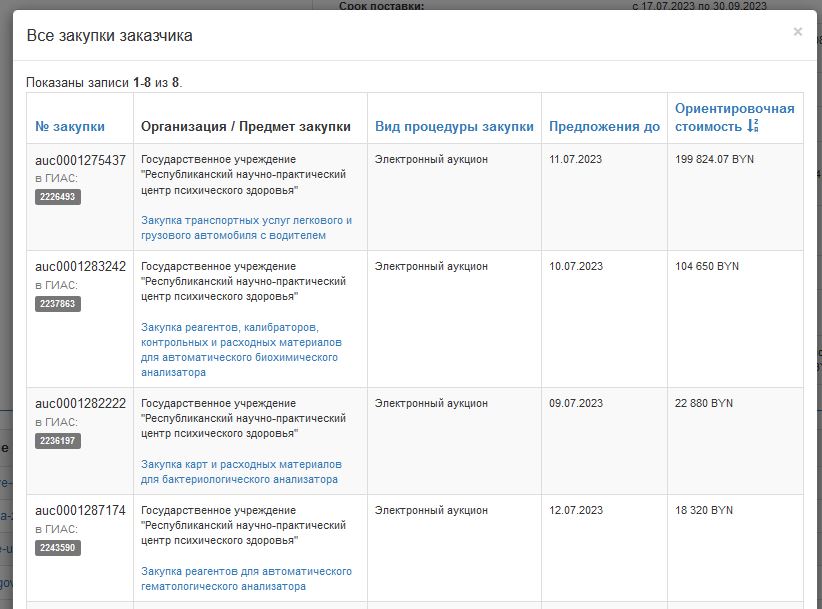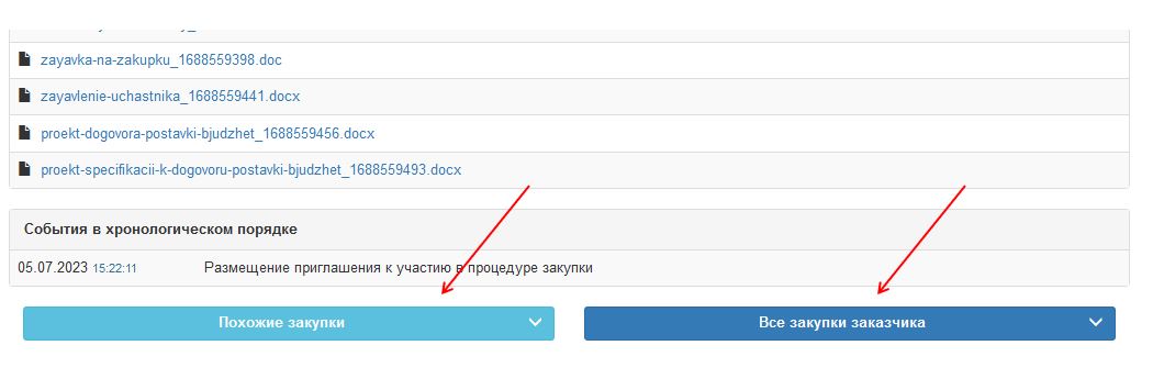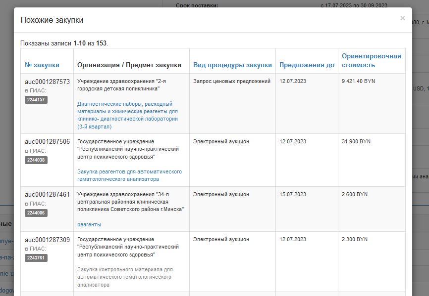 На электронной торговой площадке www.goszakupki.by реализован функционал, позволяющий при просмотре процедуры закупки получить информацию о схожих процедурах и всех активных процедурах заказчика.